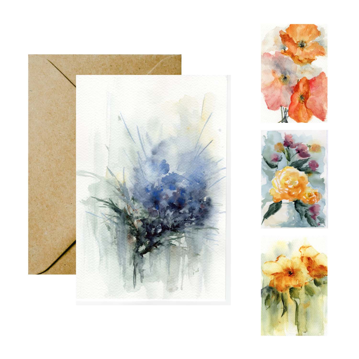 Packs of 12 notecards with envelopes, featuring four original designs.